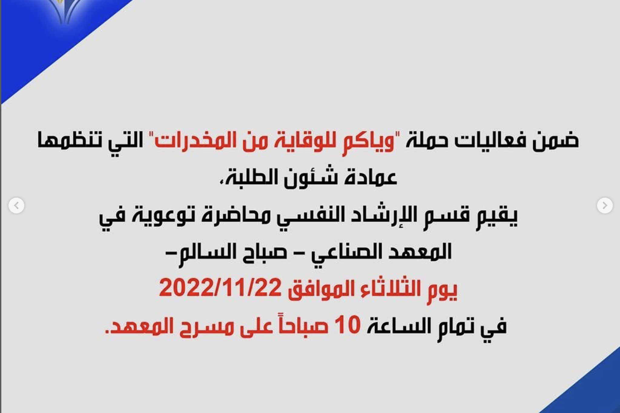 ينظم قسم النشاط الطلابي بعمادة شئون الطلبة في الهيئة العامة للتعليم التطبيقي و التدريب ندوة توعوية بعنوان "كن مدرك"
