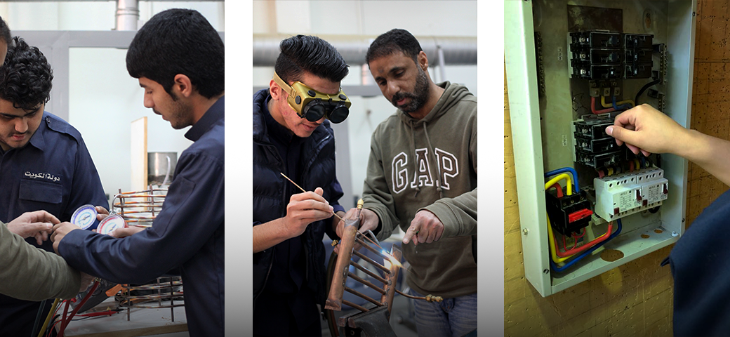 وفي تخصص التبريد والتكييف، يتعلّم المتدرب آلية عمل الأجهزة، واكتشاف الأعطال، وفك وتجميع وحدات التبريد، بالإضافة إلى استخدام أجهزة الفحص المتنوعة (مثل AVO Meters) لفحص المكونات الكهربائية.