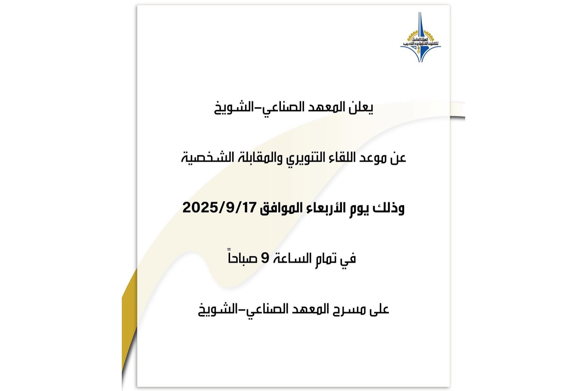 يعلن المعهد الصناعي - الشويخ عن موعد اللقاء التنويري والمقابلة الشخصية