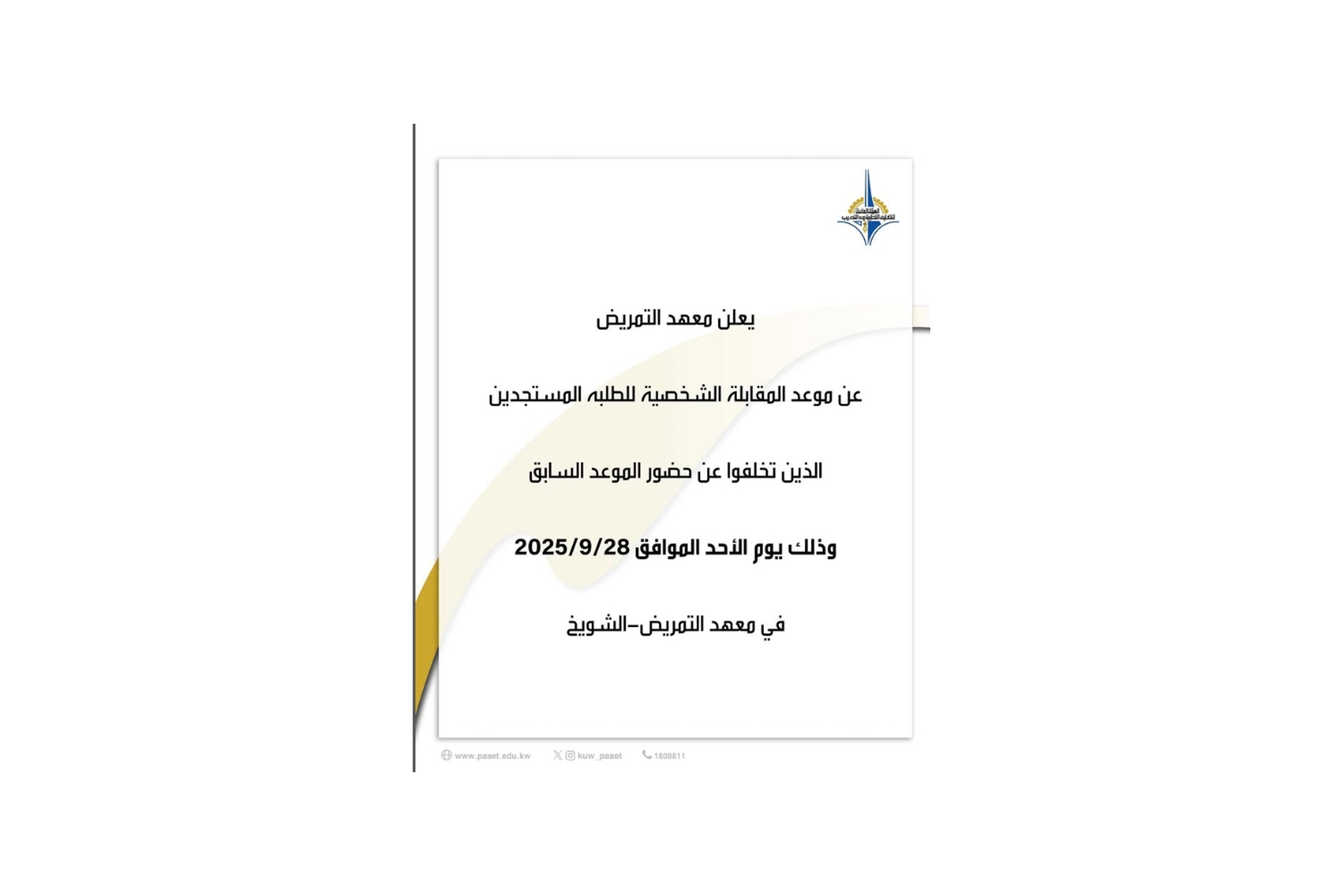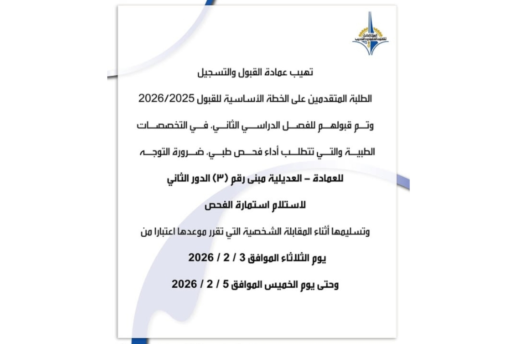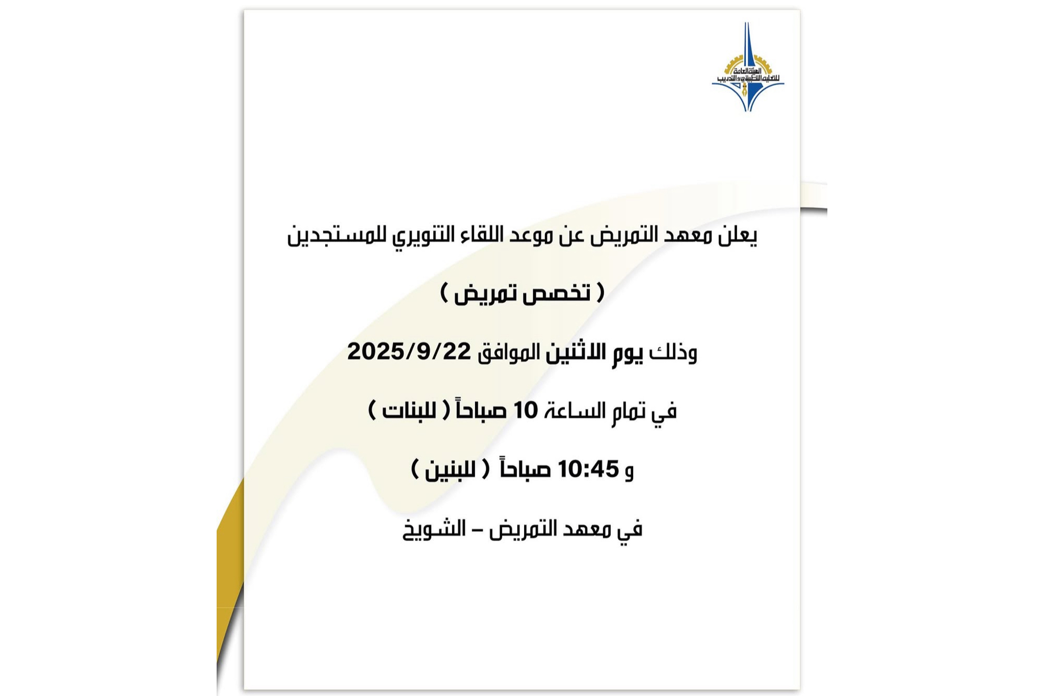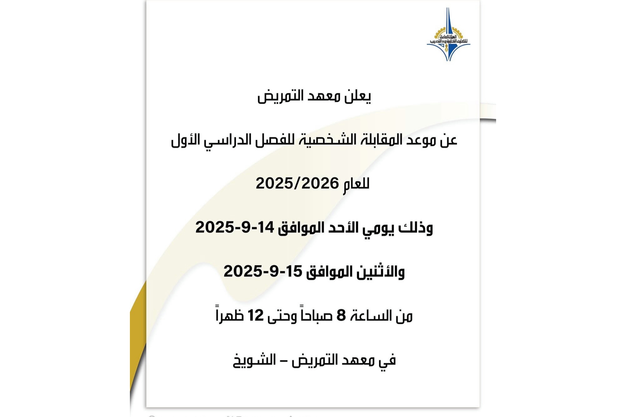 المزيديعلن معهد التمريض عن موعد المقابلة الشخصية للفصل الدراسي الاول 2025-2026