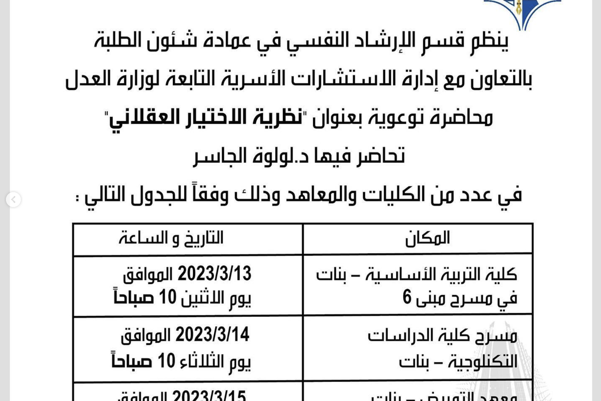 ينظم قسم الارشاد النفسي في عمادة شئون الطلبة بالتعاون مع إدارة الاستشارات الأسرية التابعة لوزارة العدل.